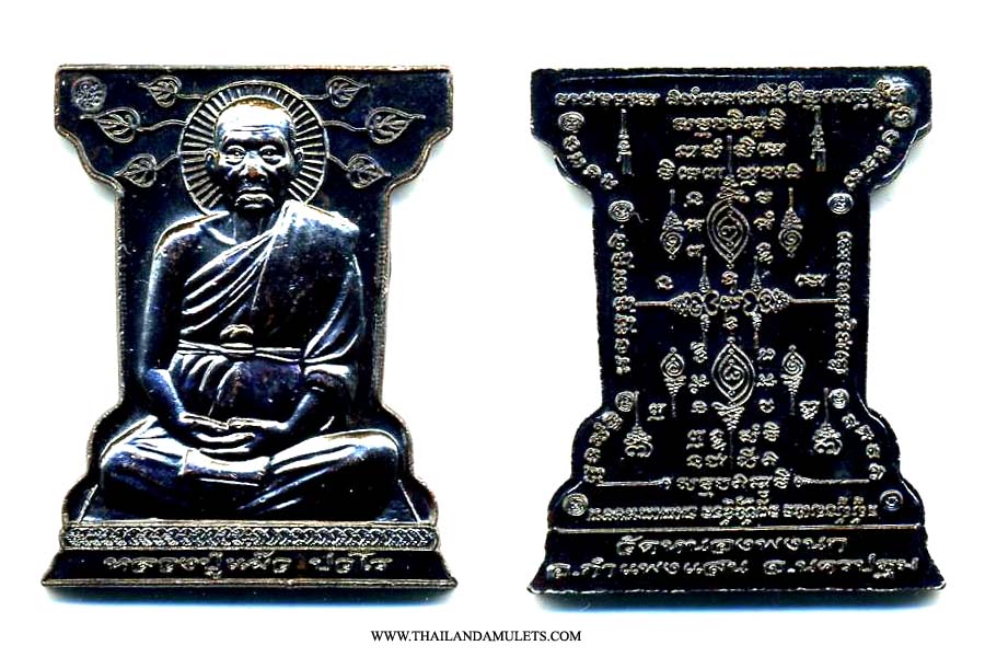 Monk amulet blessing protection to wearer fortune, bring good fortune to wearer. Frontside, image of Luangpu Paw meditation blessing, words "Luangpu Paw Powaroh". Backside, yants blessing mantras, batch and ceremony details.
