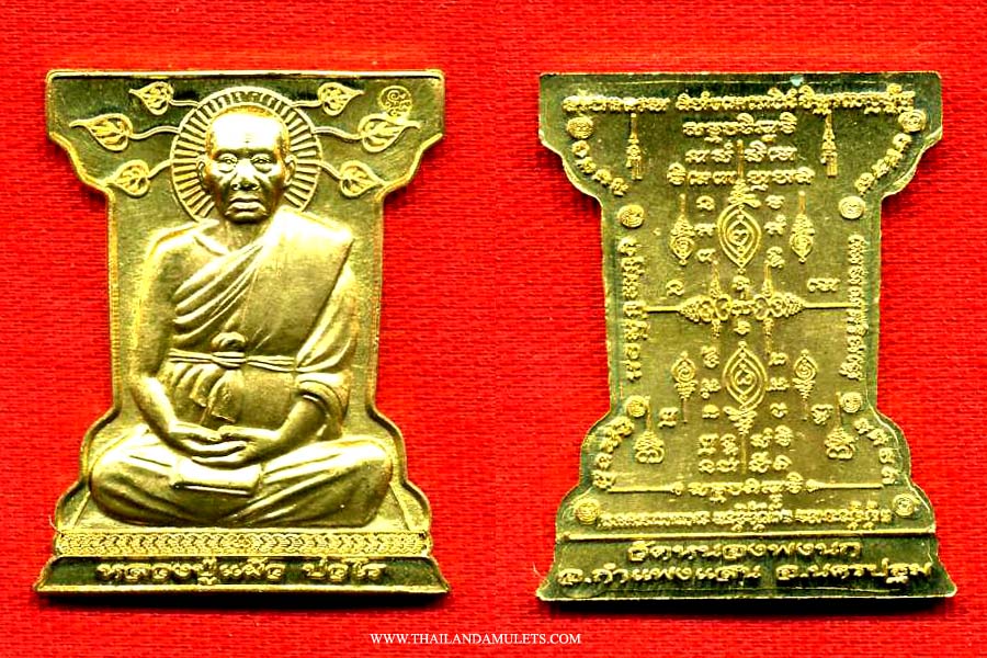 Monk amulet blessing protection to wearer fortune, bring good fortune to wearer. Frontside, image of Luangpu Paw meditation blessing, words "Luangpu Paw Powaroh". Backside, yants blessing mantras, batch and ceremony details.