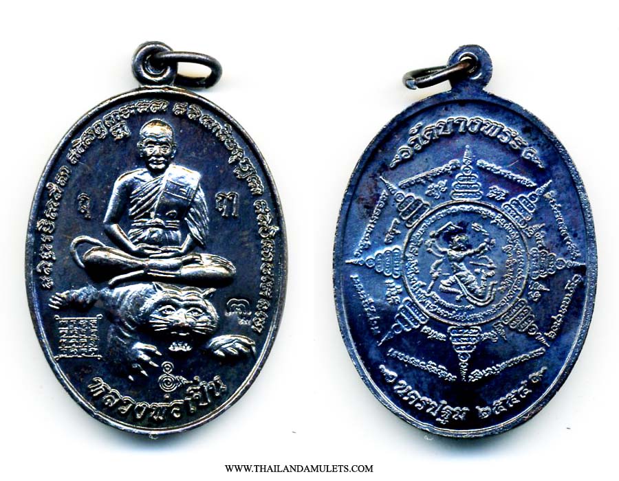 Frontside, Luangpor Pern riding tiger, meditation blessing, surround with yants blessing mantras. Backside Hanuman blessing victory and protection surround with yants mantras. Batch and ceremony details.