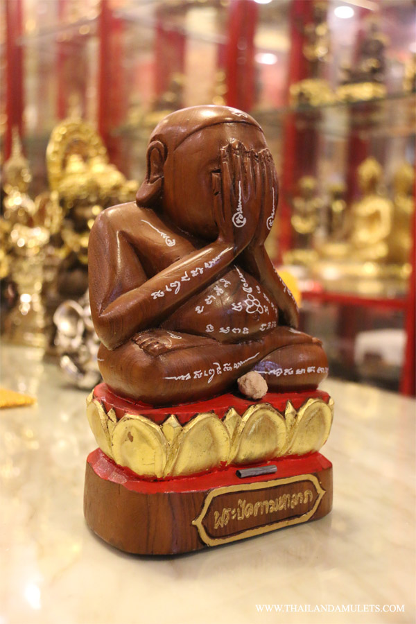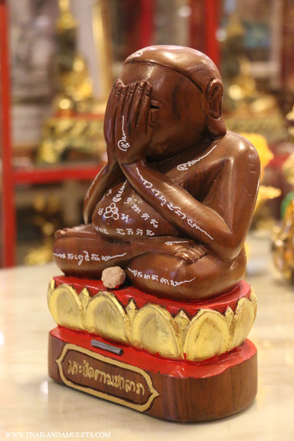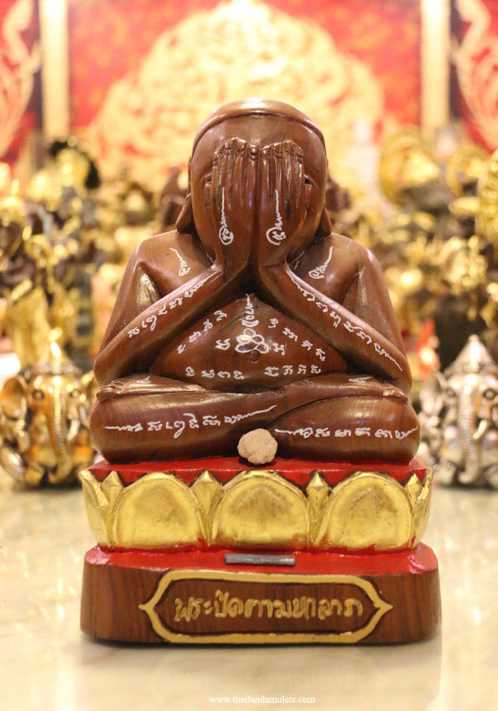 Great PhraPidda statue blessing wealth fortune, handicraft made of high quality teak(golden brown colour) wrote with yants blessing mantras, holy water with beautiful fragrance cover all body, holy powder ball ittijay attached at center. Takrut, mantra plated craft with protection mantras then rolled attached at buttom, words "PhraPidda Mahalarp"(Monk closing eyes Great Luck).