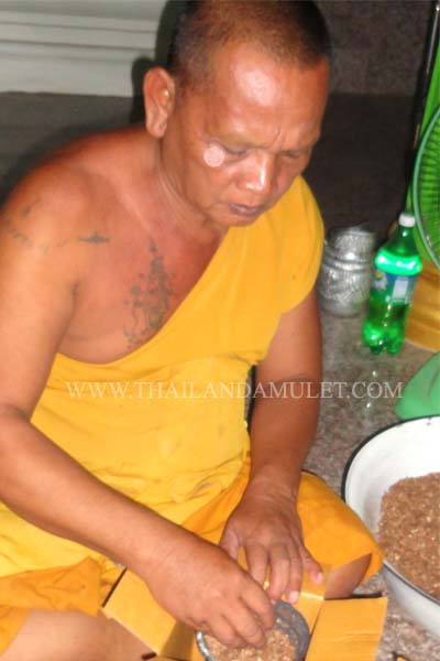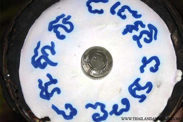 Gumarnthong Pichitchoak(Conquer fortune) shown the happy face of powerful boy with great karma, holding gold/money bag by left hand, right hand waving good fortune to prayer, blessing art of master craftmanship. Original way of ingredients/materials by 7 temples's remain of countless generation to bring strong/powerful attachment of spirits to living 1)WatNongphong 2)WatNongpednum 3)WatBander 4)WatYangnoi 5)WatPhongdinsor 6)WatPhongmalangwan 7)WatNonglangar. 7 earth/soils from old battlefields and graveyards. 7 earth elements from 7 altars, Varn herbs for Gumarnthong. Right builded ceremony to worship and consecrate holy materials. Bless/chanted with right mantras by Luangpor Teang, guru monk of Thailand. Craft with yant(Spell letters) by guru monk, wrote with yant heart of Sivali mantra. Sivali mantra blessing wealth luck into fortune. Center attached with 5 sacred woods used in ceremony, "Koon"(Multiply) "Learn"(Raise) "Sak"(Teak) "Payung"(Uphold) "Dang"(Red).