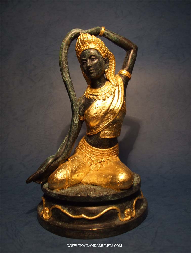 Luangpu Hong's PhraMaetoranee, God of birth and emblem of mother earth. The statue bless wealthful in life. The statue create by bronze and jade chanted from the ceremony direct from Luangpu Hong special bless/chant only at Thailandamulets.com, attached with white holy powder and chanted honey bless charm attractiveness. Mother earth statue are very famous and well known to bring kindness, respectful from people, the statue also bless strong protection fortune. Beautiful craft with gold, this is indeed the best god statue from Thailand.
