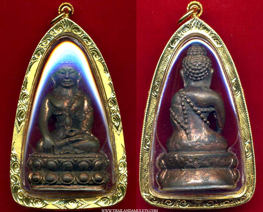 Description PhraGring Buddha Mahajak by Kruba Krissana Intawanno. One very good batch PhraGring is top quality Buddha amulet from Thailand. Made into 2 types attached with gold and silver plate at the buttom craft with mantras and dharmajakra wheel of fortune. Rare and few made. |