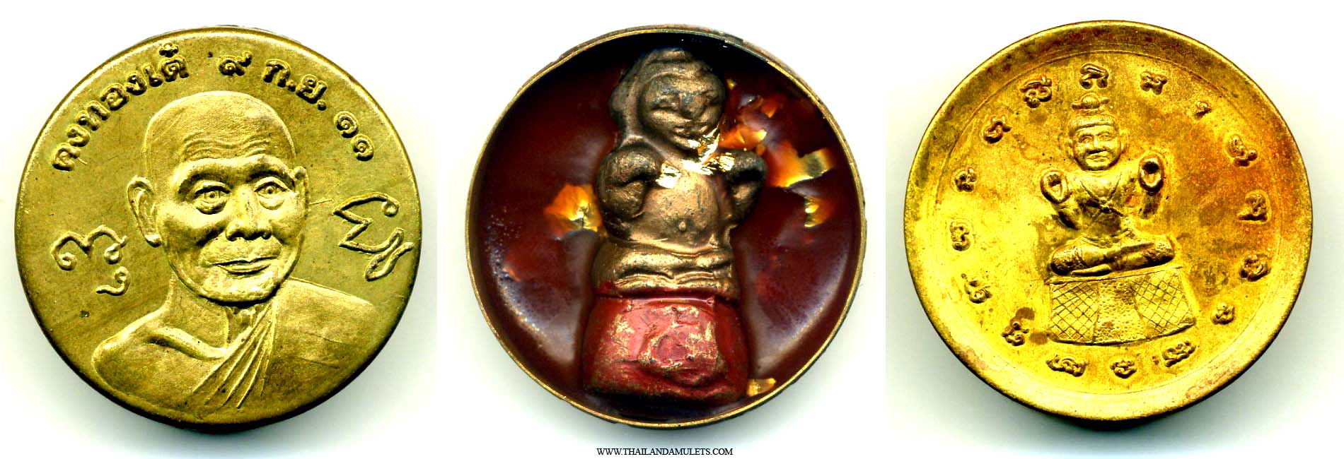 Come with brass case, front side "Khong Thong Tae 9 September b.e.2511" date of the ceremony at WatSamngam blessed/chanted by Luangpor Tae, backside image of Gumarnthong blessing surrounded with yans mantras. Powerful made blessing honey wax by Luangpor Tae Khonthong himself from WatSamngam, inside have his gumarnthong amulet living together with chanted honey. People can use this honey on their forehead, lip, center part of the head for blessing strong charm/attractiveness, love and respect from people around. Very powerful, once done can use the amulet for wear or can keep the whole case like any Gumarnthong for their blessing. Rare and precious Lp.Tae's gumarnthong.