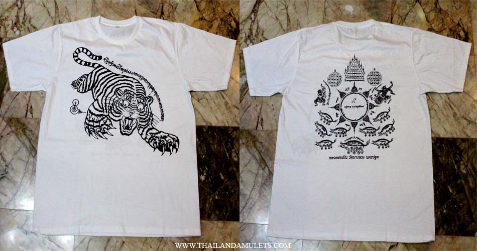 Description 100% genuine blessing mantra t-shirt Luangpor Pern from WatBangphra temple. Frontside, image of Luangpor Pern riding tiger, backside yant(Spell letters) mantras blessing fortune and protection.
